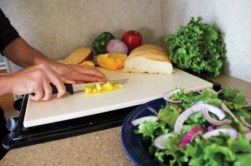 - Quiet stovetop rattle and add much-needed counter space in the RV kitchen
