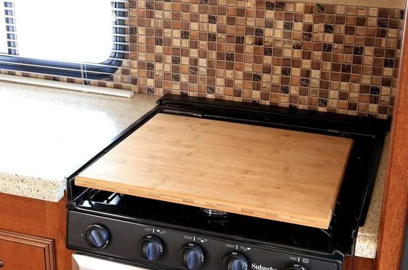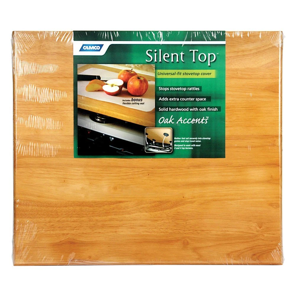 Silent Top with Flexible Cutting Mat by Camco®. Camco RV Universal Stovetop Cover silences annoying stovetop rattles and adds valuable counter space to your RV. Solid hardwood stovetop cover hides and protects burners. Non-toxic gloss finish for extra moisture protection.