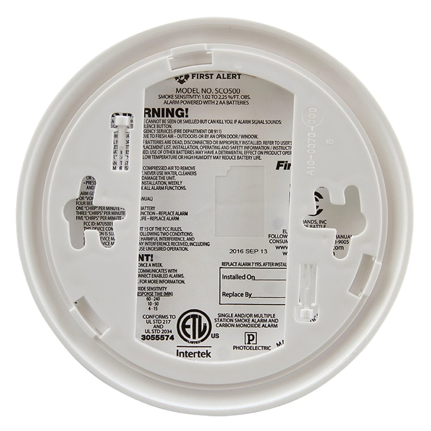 White Surface Mount Interconnected Smoke/Carbon Monoxide Alarm by First Alert®. The First Alert CO400 Carbon Monoxide Alarm utilizes an electrochemical carbon monoxide sensor that lasts for up to five years to detect carbon monoxide. This carbon monoxide detector is battery operated, making it portable and easy to use, even in the event of a power outage. When carbon monoxide levels become elevated, a loud 85-decibel alarm alerts you to the threat.